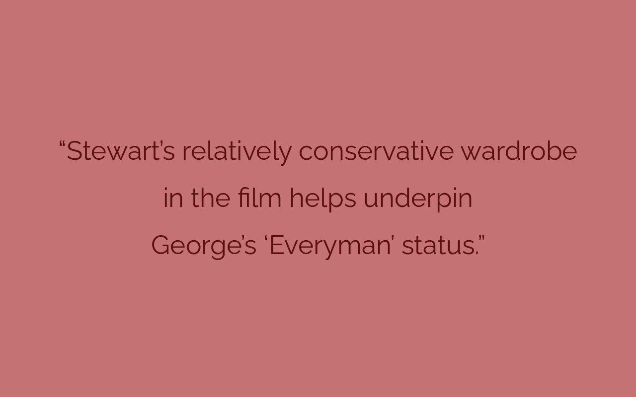 Stewart’s relatively conservative wardrobe in the film helps underpin George’s ‘Everyman’ status. There is nothing flashy, no artifice to the clothes to suggest a Hollywood costume designer has been at work (even though there was one – Edward Stevenson). In fact, so apparently comfortable was Stewart in the tweed suits, hats and heavy twill overcoats (it is mostly set over a snowy Christmas, even if some of the white stuff on show was actually asbestos) that viewers might have been forgiven for thinking that the credit should have read: ‘Mr. Stewart’s Wardrobe: Actor’s Own’.